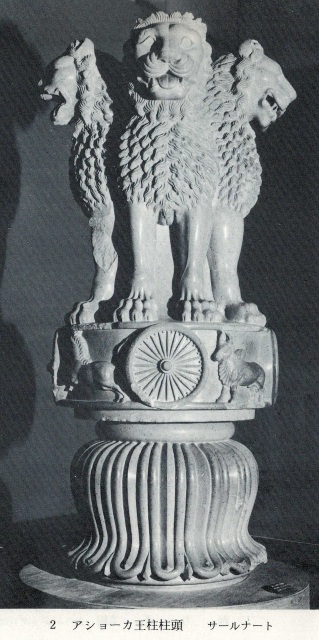 アショカ王、紀元前三世紀、マウリヤ朝の大帝国を築いた。戦争の残虐性を深く後悔して武力でなく、ダルマ(法)で国を治めようとした。そして、詔勅を発布し、国の至る所に石柱や磨崖に刻ませた。内容は不殺生、父母に対する敬愛、他人に対する尊敬……等、自己反省まで入っている。一番有名なのが柱頭に4頭のライオンを戴くつるつるに磨かれたアショカ王柱(石柱高さ約13メートルというのがまたすごい)、インド美術史の白眉である(写真2)。その柱の下の方にこの碑文がある(写真3)。私の問題にしている断片は石柱ではなく、磨崖に刻まれたものの一部であろう。もしホンモノなら。
